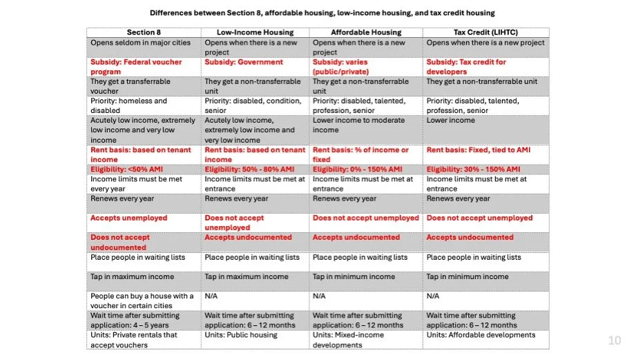 If suitable housing options are not available at the time of the appointment, provide education on the different types of low-income housing programs. I